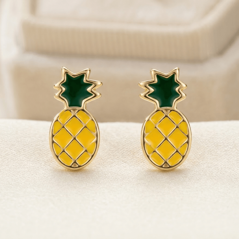 Add a tropical vibe to your accessories with these adorable pineapple stud earrings. Designed with vibrant yellow enamel and a gold-tone outline, they offer a cheerful and stylish look. Perfect for summer outfits, vacations, or anyone who loves playful jewelry designs.